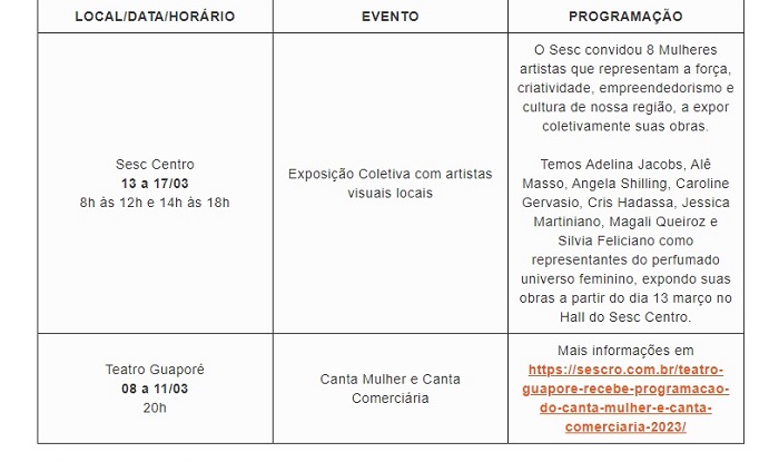 O Sesc está com programação especial neste mês de março, com destaque para o protagonismo feminino em diferentes áreas de atuação. Intitulado Sesc Mulher – Diálogos, a programação ocorrerá durante todo o mês com diversas atividades voltadas para o universo feminino, a condição das mulheres, suas demandas e suas vozes. As atividades serão gratuitas.