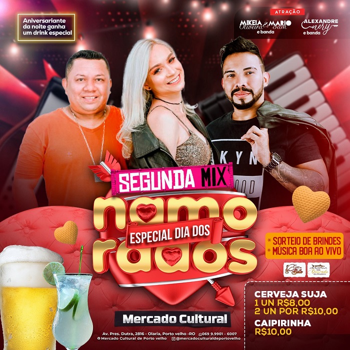 O espaço público, histórico, cultural e turístico da capital rondoniense vai entrar no clima dos casais apaixonados, com festa neste segundo-feira, dia 12, a partir das 19h, com churrascada, promoções de bebidas e petiscos e muita música boa no palco do Mercado Cultural de Pvh.