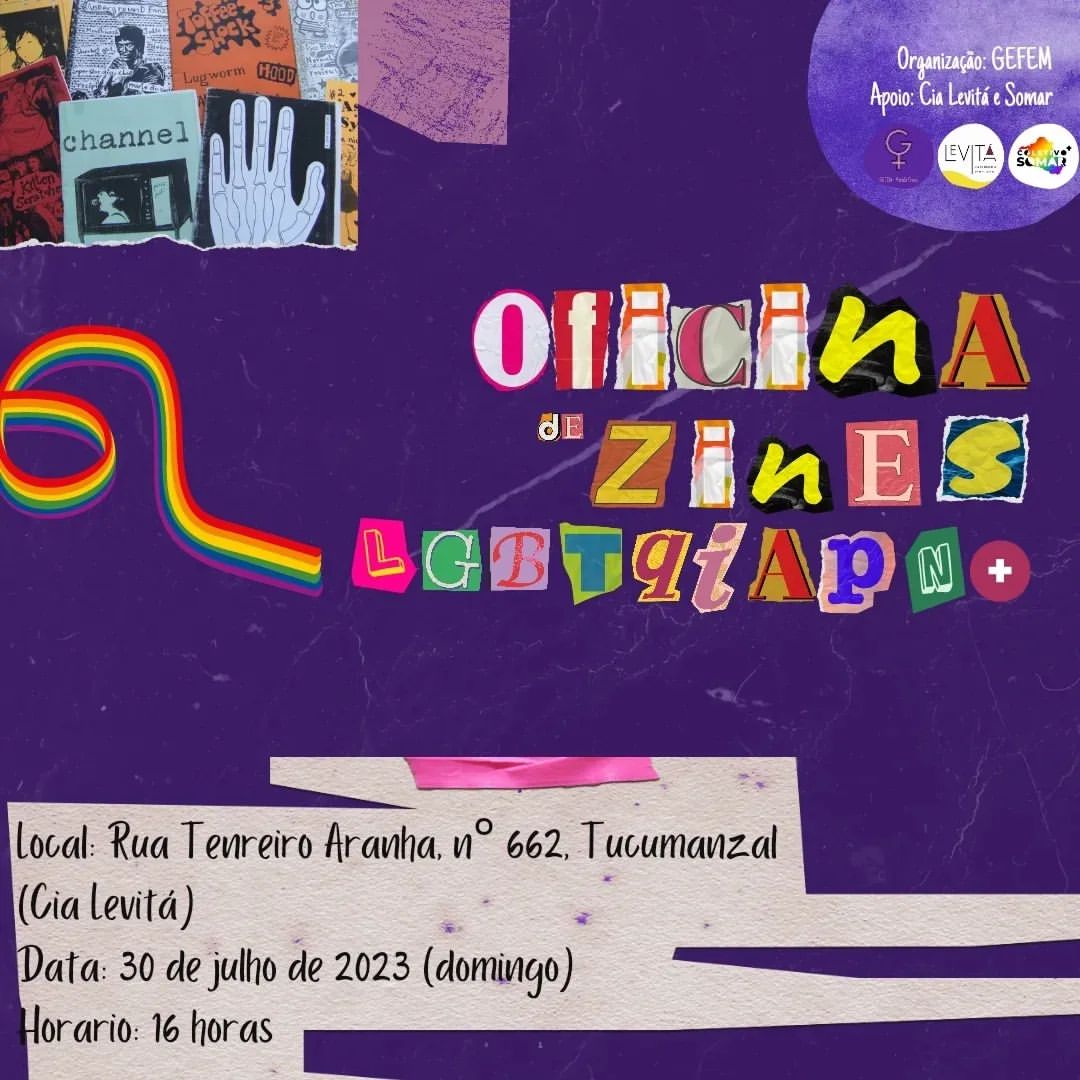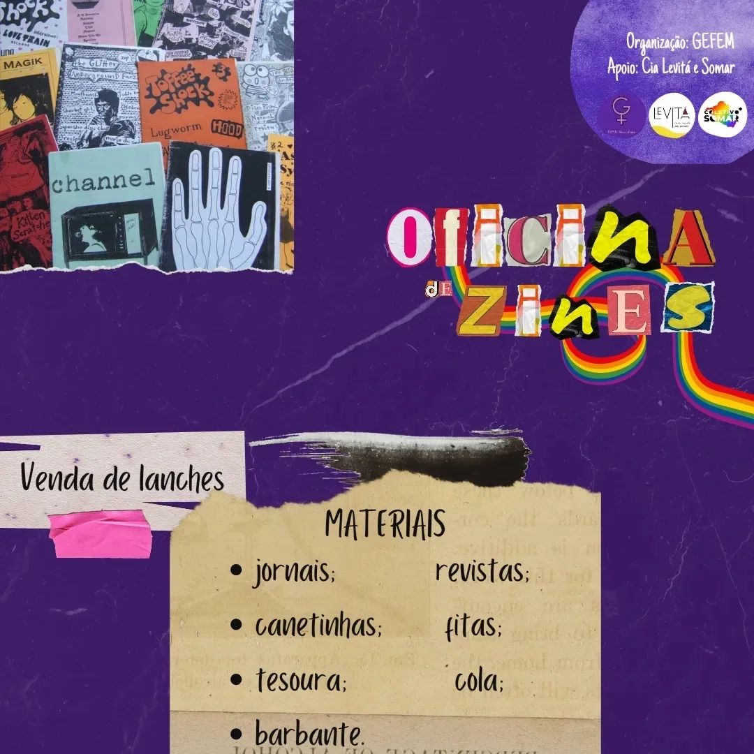 A oficina de zines é uma organização do GEFEM, e conta com o apoio do Coletivo Somar e da