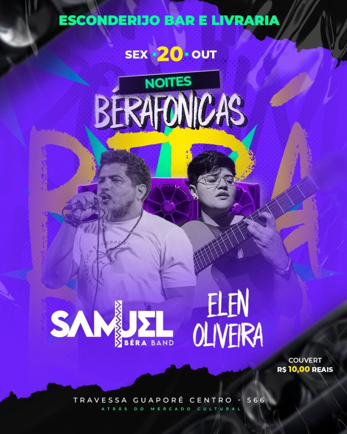 Com animação de Samuel Bera Banda e Ellen Oliveira, acontece nesta sexta-feira,20, o Noites Bérafonicas, a partir das 20 horas, no Esconderijo Bar e Livraria. O evento é aberto ao público. O couvert é de R$ 10,00.