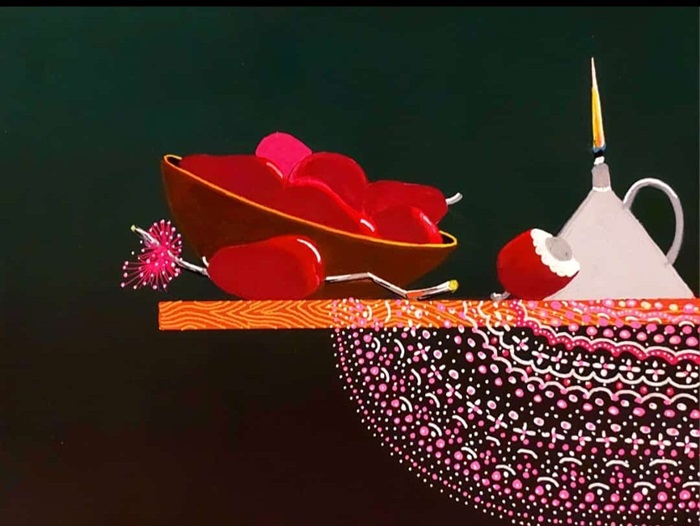 A exposição está dividida em dois eixos centrais. O primeiro, com obras de natureza morta, apresenta frutos e elementos do cotidiano amazônico, como rendas e bordados, lamparinas, babaçu, tucumã, entre outros.