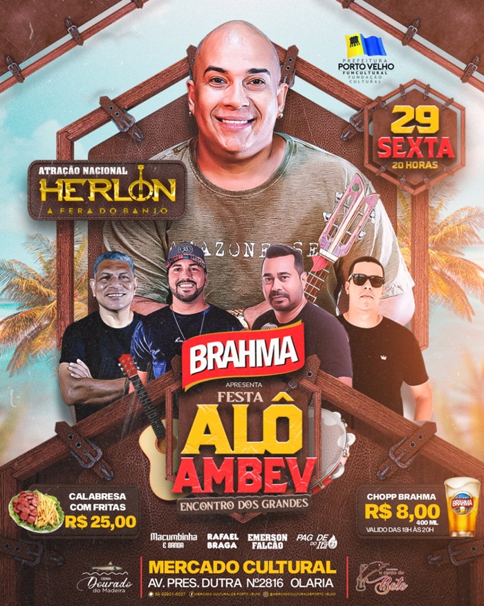 Nesta sexta-feira, dia 29, a partir das 20h, tem shows gratuitos com grupos locais e atração nacional no evento músical "Alô Ambev, a Festa!", que acontece todas as sextas no palco do Mercado Cultural de Pvh.