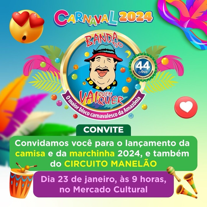 A Banda do Vai Quem Quer lança oficialmente a camisa/abadá 2024 nesta terça-feira, 23/01, às 9h no Mercado Cultural de Porto Velho, junto com o lançamento do Curcuito Manelão, da Semdestur.