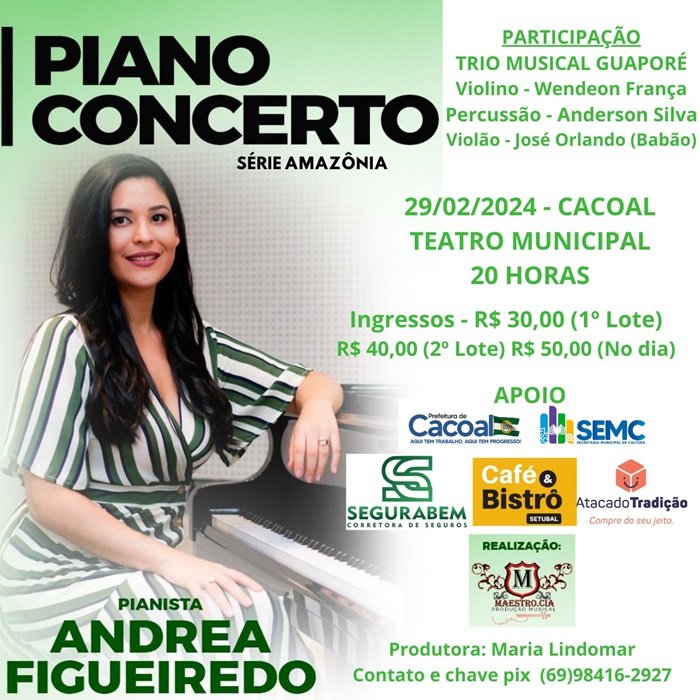 A pianista rondoniense Andréa Figueiredo fará apresentação única no Teatro Municipal de Cacoal no evento Piano Concerto - Série Amazônia, que contará com a participação do Trio Musical Guaporé, formado por Wendeon França (Violino), Anderson Silva (Percussão), José Orlando (Violão). A atividade será no dia 29, às 20 horas.