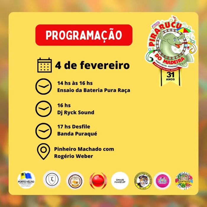 Mestre Bainha, compositor, passista, instrumentista e intérprete, será o grande homenageado no desfile do bloco de rua Pirarucu do Madeira, neste domingo. A concentração será a partir das 14 horas na esquina das avenidas Pinheiro Machado e Rogério Weber, quando terá ensaio da bateria Pura Raça, que animará o desfile, previsto para iniciar às 17 horas. Veja a programação no final do texto.