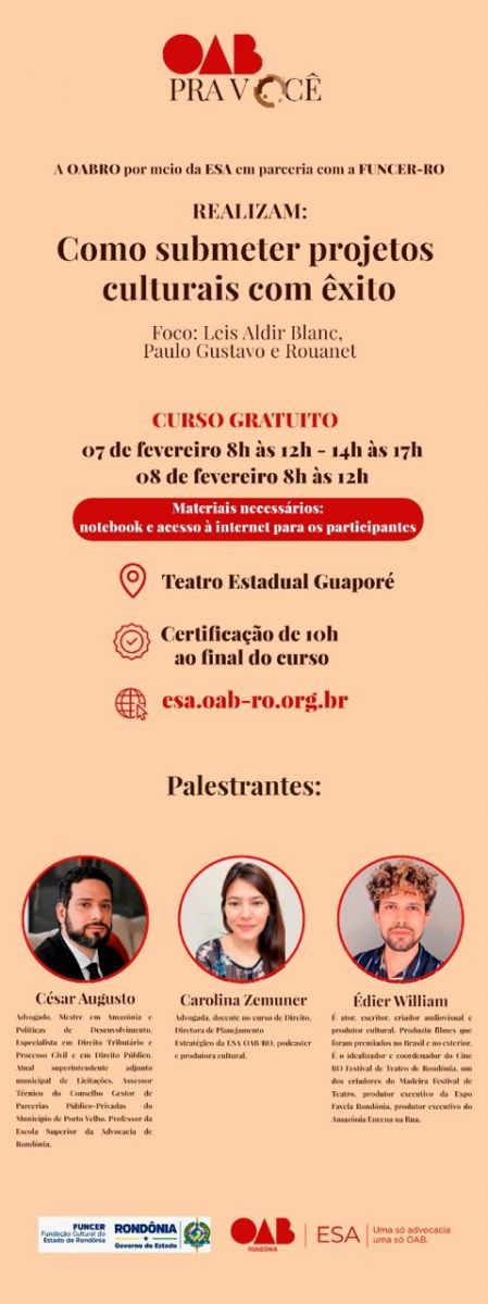 A atividade é promovida pela OAB Seccional Rondônia, por meio da Escola Superior da Advocacia (ESA), em parceria com a Fundação Cultural do Estado de Rondônia (Funcer).