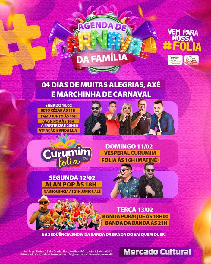 "Traga a sua família para brincar os 4 dias de carnaval neste espaço público, histórico e turístico da nossa capital", enfatizou o empresário Sinezio Tapajós, permissionário do box Dourado do Madeira, onde terá muito frevo, marchinha e axé music no 'Carnaval da Família', que vai acontecer de sábado, dia 10, a terça-feira, dia 13, no Mercado Cultural de Pvh. O evento é gratuito.