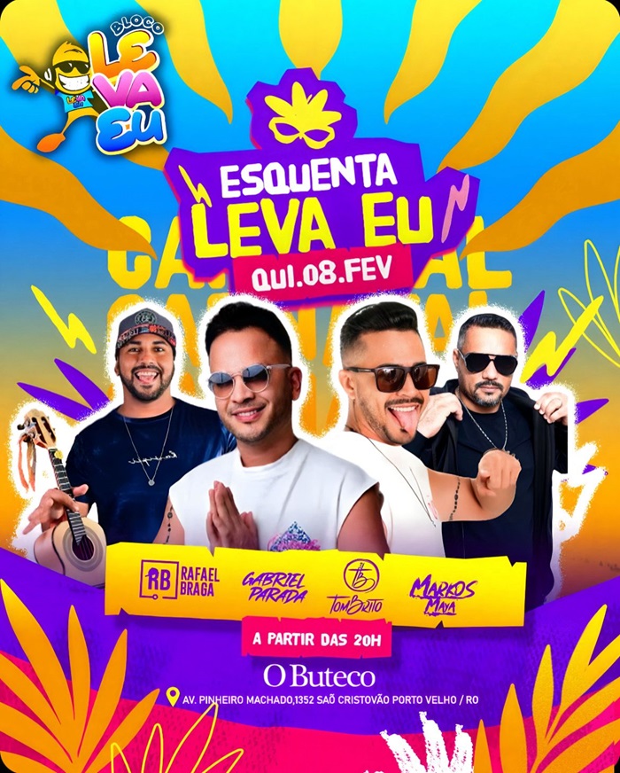 O tradicional bloco carnavalesco LEVA EU realiza hoje a noite, a partir das 20 horas, no O BOTECO, localizado na Av. Pinheiro Machado, 1356, bairro São Cristóvão, o grande encontro de gigantes dos trios elétricos de carnaval, com os cantores Gabriel Parada e Tom Brito, considerados os expoentes da atualidade musical em Rondônia, quando se fala em festas e carnaval.