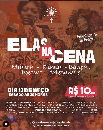 Com a participação de mais de 15 mulheres artistas, a Casa da Mata promove neste sábado, 23, o evento “Elas em Cena”, a partir das 20 horas. A programação inclui música, rimas, danças, poesias e artesanato.