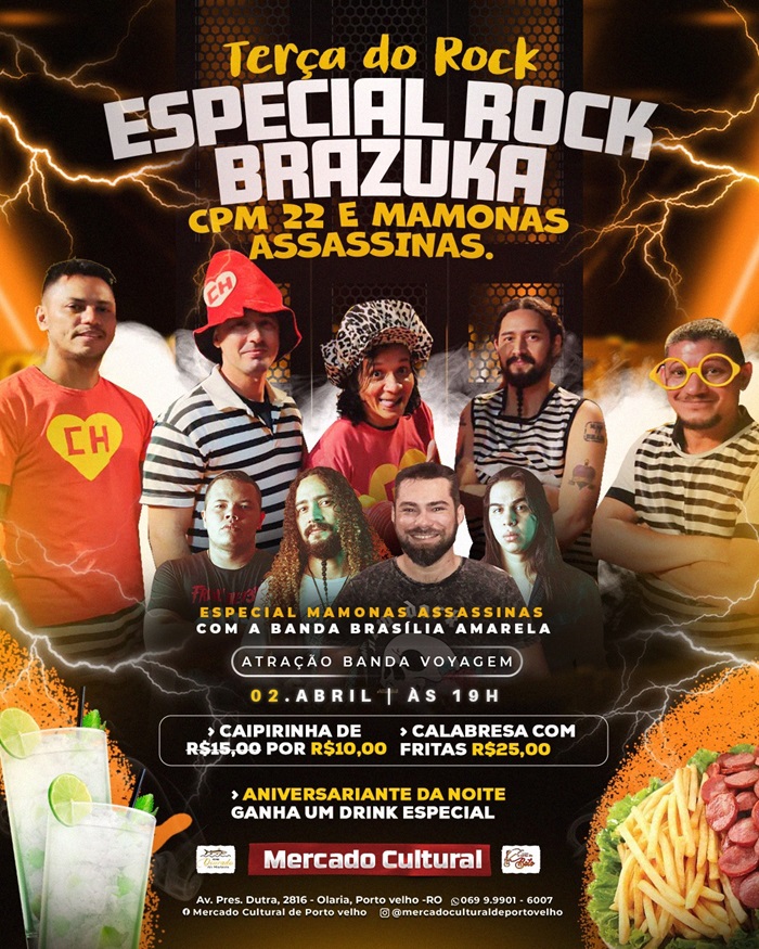 "A nossa edição de hoje, dia 02, da 'Terça do Rock' terá o 'Especial Rock Brazuka', que começa a partir das 19h30, com interpretação da saudosa banda Mamonas Assassinas e CPM 22 no palco do Mercado Cultural". Traga a sua família para curtir esse show duplo e gratuito", convidou o empresário Sinezio Tapajós, permissionário do box Dourado do Madeira.
