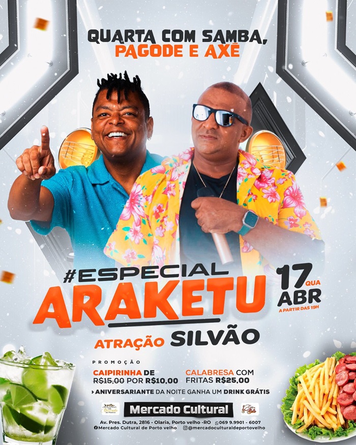 As canções recheadas de pagode e raggae do grupo baiano Araketu farão parte do repertório do músico porto-velhense Silvão durante show no palco do Mercado Cultural nesta quarta-feira,17, a partir das 19 horas.