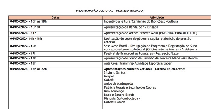 A empresa informou que nesta primeira etapa do projeto está sendo formatada uma praça de alimentação com food-trucks locais. Além disso, haverá atrações musicais realizadas em parceria com a Funcultural e a Fecomércio. De acordo com Normando, a programação cultural será contínua durantes os próximos meses, a exemplo do Palco Giratório, que acontecerá nesse espaço, assim como outros eventos que ocorrerão ao longo do ano.