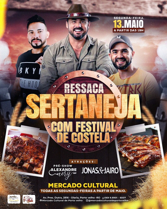 "Para você que perdeu a nova versão da melhor noite de segunda da capital rondoniense, hoje tem a continuação do evento musical e gastronômico 'Ressaca Sertaneja' no Mercado Cultural de Pvh", enfatizou o empresário Sinezio Tapajós, permissionário do box Dourado do Madeira, acrescentando que o primeiro show será às 19h, com Alexandre Nery, na sequência, showzaço com Jonas & Jaíro.