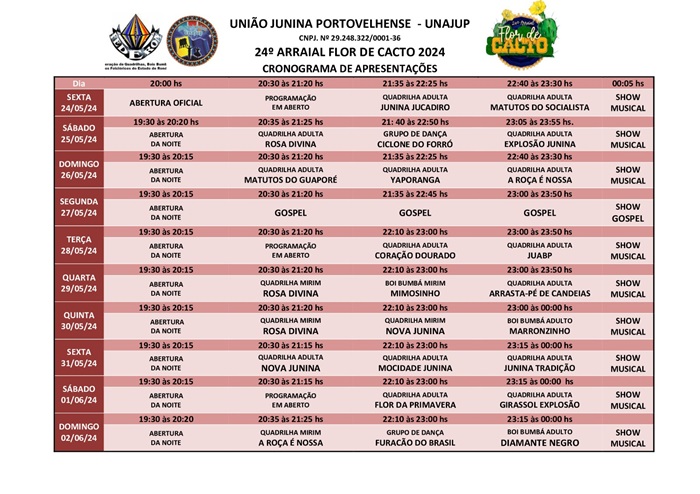 A programação do Arraial Flor de Cacto continua nesta terça-feira,28,com apresentação das quadrilhas Coração Dourado e Junina JUABP. A primeira entra em cena às 21h30, e a segunda, às 22h30. O show musical inicia às 23h30.