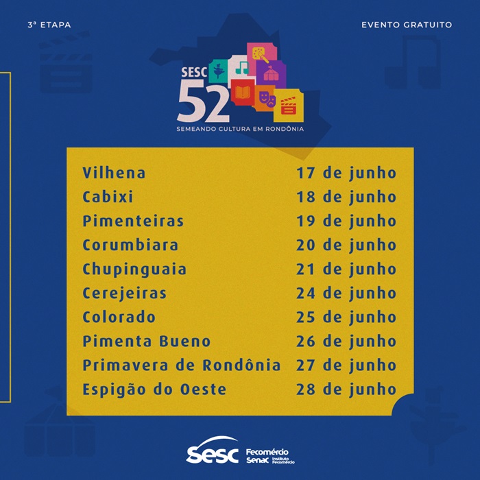 O projeto ‘Sesc 52’ deu início a 3ª etapa na cidade de Vilhena. Até final do mês, 10 cidades de Rondônia receberão as ações artístico-culturais que o projeto prevê. A ideia é fomentar a cultura regional, fortalecendo os artistas locais e expandir o acesso da cultura às comunidades, de forma gratuita.