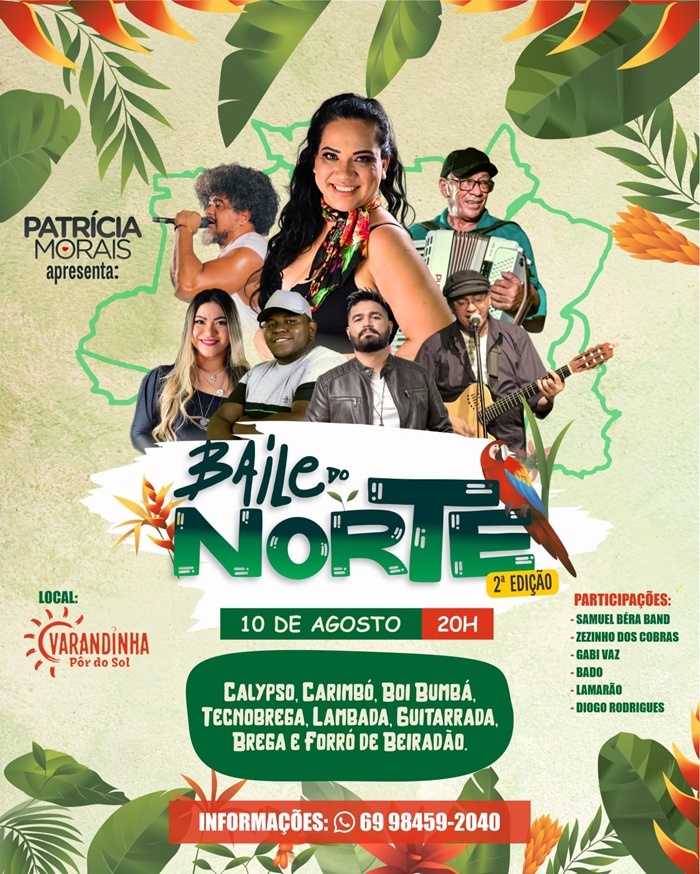 Em seguida tem Patrícia Morais com o show “O Norte tem Som”. Ela levará ao público um repertório dançante e marcante, entre eles o Carimbó, Calypso, Brega, Boi Bumbá, Lambada etc.