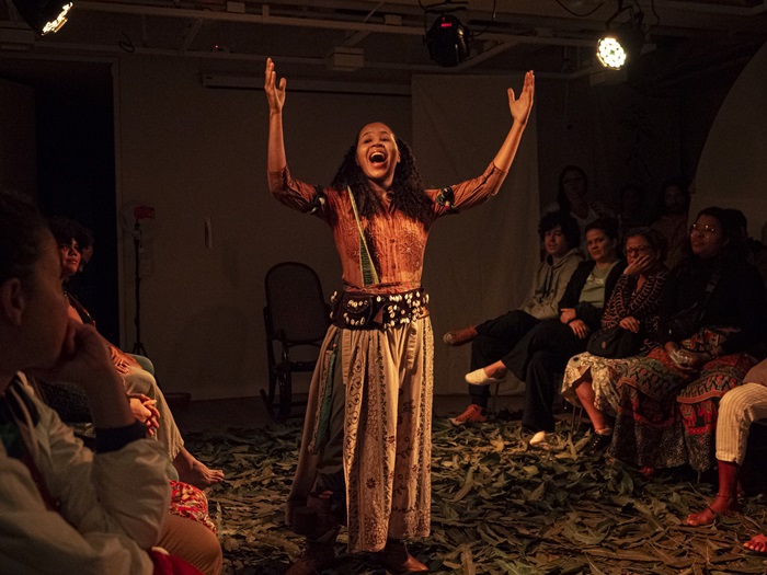 A atriz Jam Soares, em sua performance, inspira-se, na líder revolucionária Tereza de Benguela e nas mulheres afroamazônidas. A autora tece uma dramaturgia de quadros cênicos fragmentados em um tempo espiralar, introduz pensamentos decoloniais com foco na Amazônia, explora a ancestralidade e destaca a força de lideranças negras.