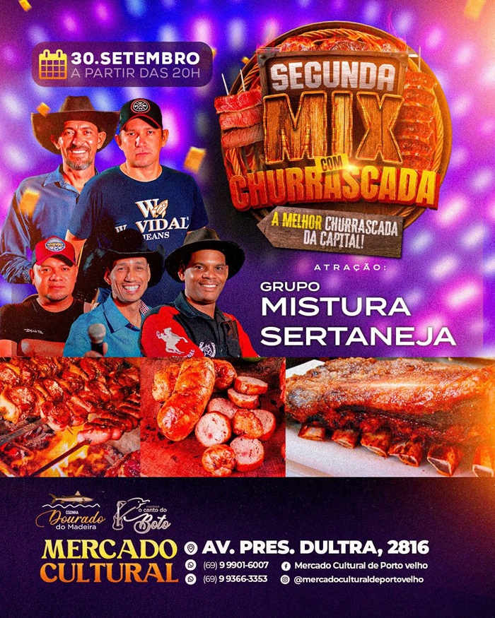 "Hoje, virada do mês, vai rolar aquela churrascada e os drinks especiais, a partir das 19h, na melhor noite de segunda-feira da capital rondoniense, a 'Segunda Mix', com show do Mistura Sertaneja", enfatizou o empresário Sinezio Tapajos, permissionário do box Dourado do Madeira, localizado no Mercado Cultural de Porto Velho.