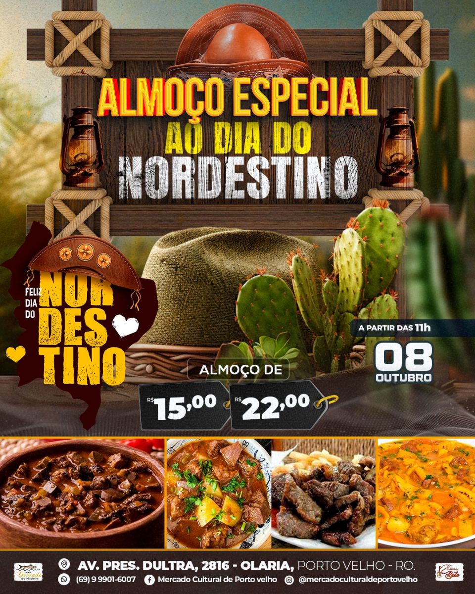 "Com refeições custando entre R$ 15,00 e R$ 22,00, vamos realizar um almoço especial para o Dia do Nordestino, homenageando esses queridos irmãos e suas famílias do Nordeste", disse o empresário Sinésio Tapajós, permissionário do box Dourado do Madeira, ao divulgar o cardápio deste evento gastronômico, que acontecerá nesta terça-feira, dia 08, das 10h40 às 14h40, no Mercado Cultural de Porto Velho.