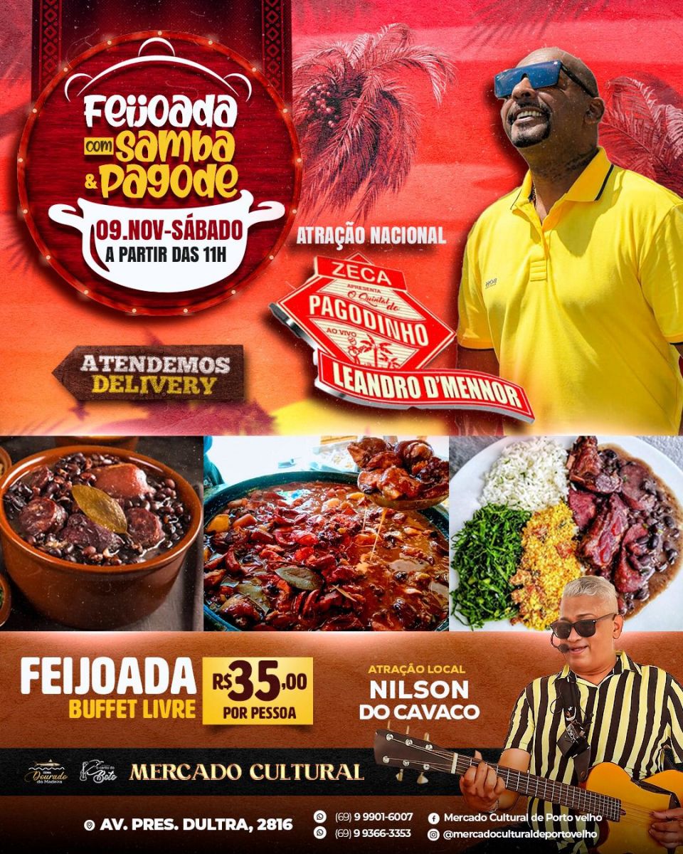 "Neste sábado, dia 9, a partir das 12h, diretamente do Rio de Janeiro, para ser mais preciso, lá do Quintal do Zeca Pagodinho, iremos realizar o show do músico Leandro D'Mennor, na nossa tradicional 'Feijoada Com Samba e Pagode', diga-se de passagem, a mais barata da cidade, que custa apenas R$ 35,00 por pessoa, com buffet livre", disse o empresário e permissionário do box Dourado do Madeira, Sinésio Tapajos, acrescentando que o evento gastronômico terá também shows do Nilson do Cavaco, seguido de Pagode Na Veia. Os shows são gratuitos.