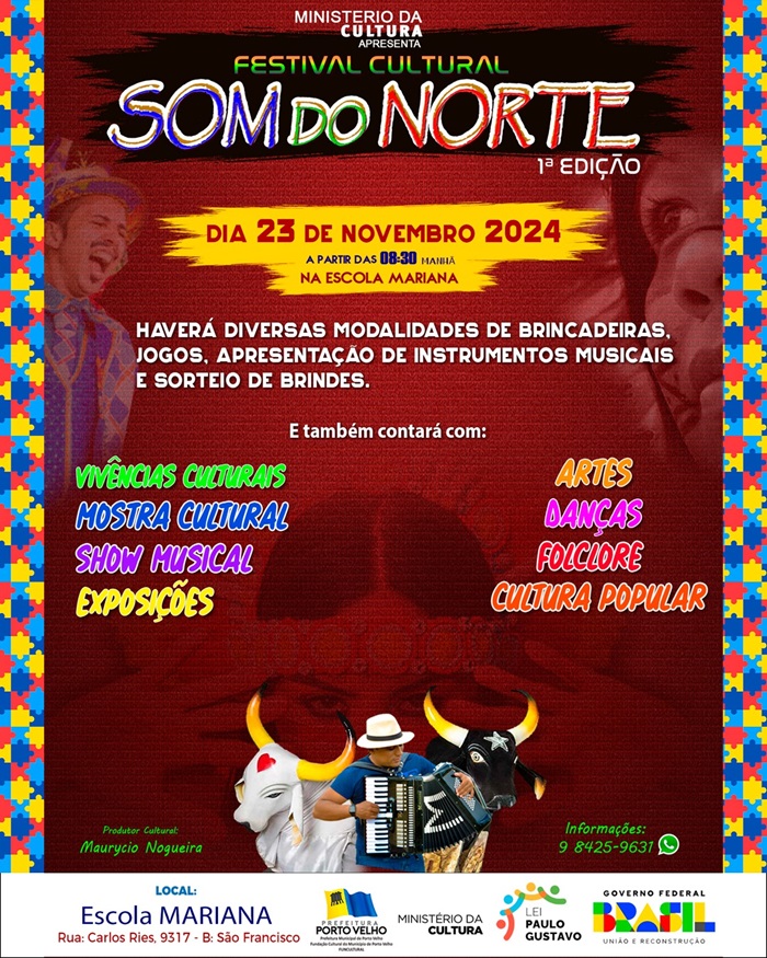 O evento é promovido pelo músico e produtor cultural Maurício Nogueira com recursos da Lei Paulo Gustavo, via Funcultural. A atividade é gratuita e aberta à comunidade. Terá exposição de artes, vivências culturais, shows musicais, dança, folclore e cultura popular.Terá ainda recreação infantil e atividades educativas.