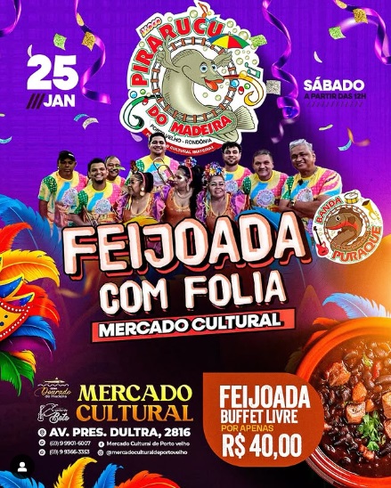 O evento Feijoada com Folia acontece dia 25 de janeiro. A feijoada será buffet livre pelo valor de R$ 40,00. A ação visa arrecadar recursos para custear o desfile do Bloco Pirarucu do Madeira, a ser realizado no dia 23 de fevereiro.