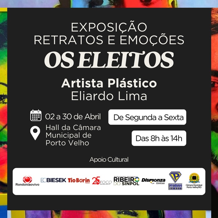 A mostra reúne 22 trabalhos inéditos do artista Eliardo Lima retratando os vereadores eleitos em 2024, assim como o prefeito de Porto Velho, Léo Moraes, e a vice-prefeita Magna dos Anjos.