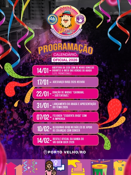 “A Banda do Vai Quem Quer já está pronta para entrar em campo com um calendário oficial de tirar o fôlego e muita festa para viver do começo ao fim. O grande desfile acontece no dia 14 de fevereiro, mas até lá tem ação, alegria, encontros e muita tradição para a gente celebrar junto. Marque na agenda e venha viver a melhor época do ano com a gente”, disse a presidente.
