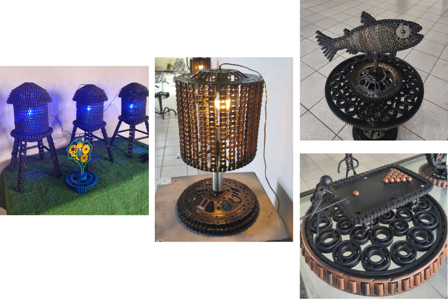 Denilson, que tem 42 anos de idade, usou de toda a sua criatividade e criou inúmeros artefatos utilizando apenas peças recicladas.