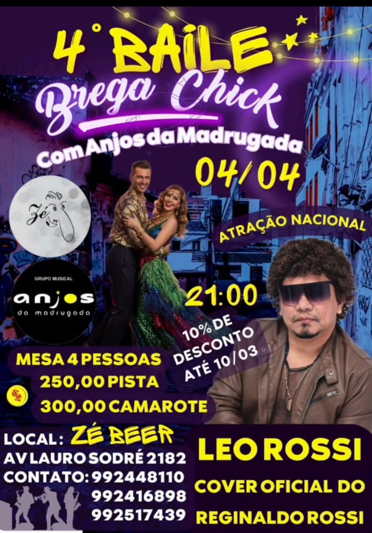 Grupo Musical Anjos da Madrugada apresenta o 4° Baile Brega Chick, dia 04 de abril a partir das 21h, no Zé Beer Eventos com atração nacional inédita Léo Rossi, Cover oficial do Reginaldo Rossi pra animar a festa mais brega de Porto Velho.