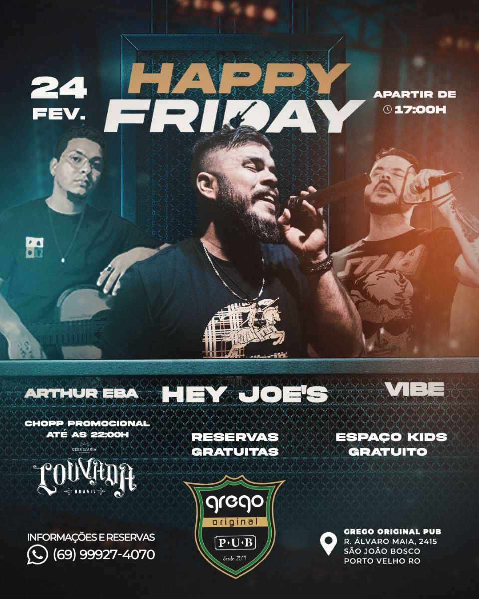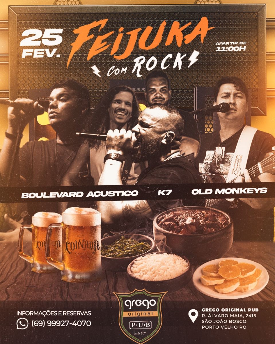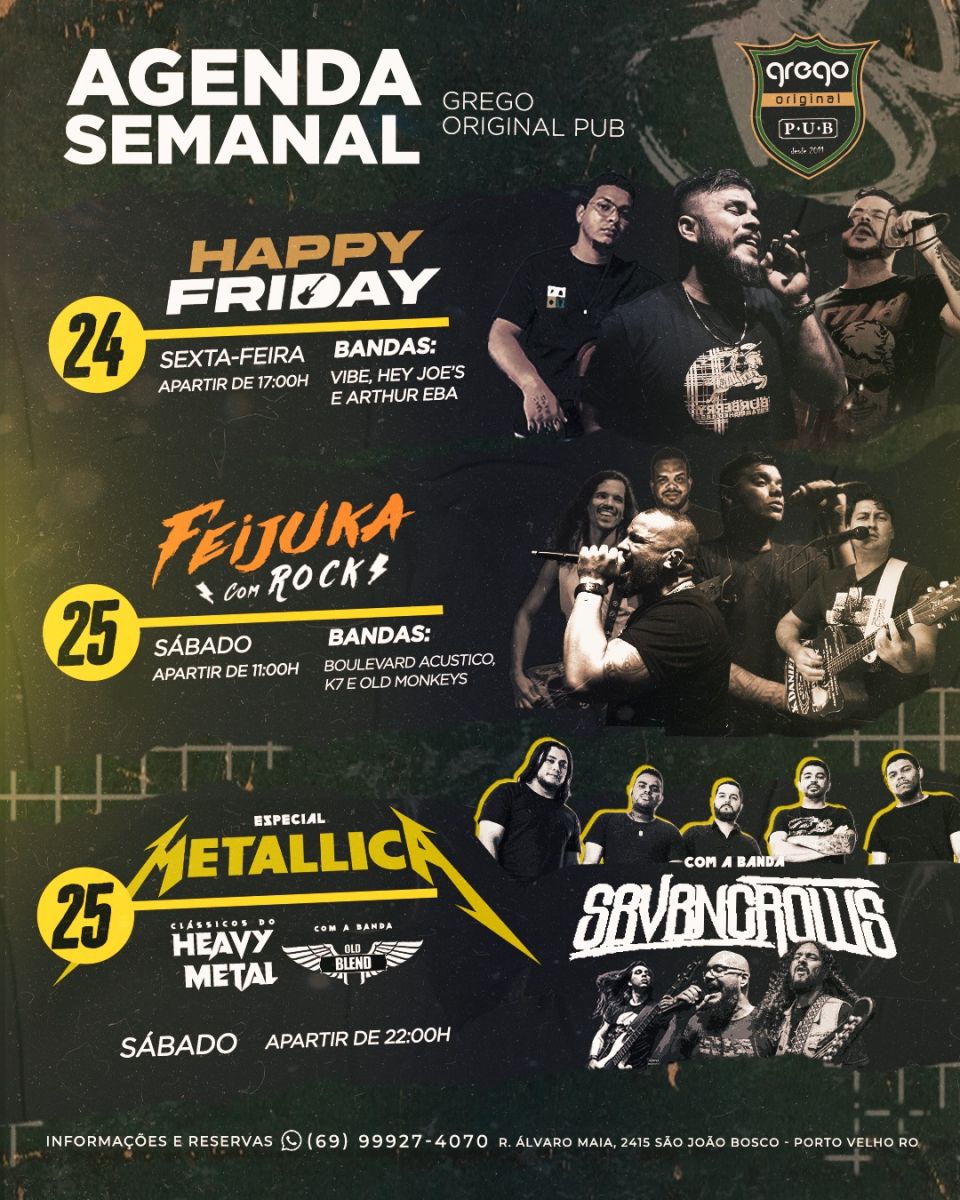 Para você que curte um bom rock feito com estilo, a opção é o premiado Pub porto-velhense, o Grego Original, que tem eventos nesta sexta-feira e prossegue no sábado com a Feijoada com Rock, a partir das 11h, e finaliza a noite, com o especial Metallica e clássicos do heavy metal.