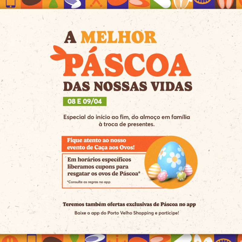 Com a Páscoa se aproximando, o Porto Velho Shopping está se preparando para uma programação especial que promete encantar toda a família. Nos dias 8 e 9 de abril (sábado e domingo), o empreendimento irá realizar uma ação de Caça aos Ovos em parceria com as lojas do shopping, e os clientes que quiserem participar poderão ganhar um ovo de Páscoa.