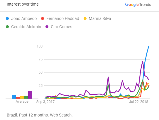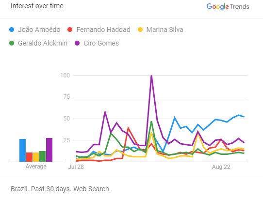 Já as buscas por João Amoêdo tiveram grande crescimento a partir do dia 14 de agosto. Neste dia, o candidato divulgou sua lista de bens e patrimônio - com R$ 425 milhões, trata-se do presidenciável mais rico na disputa.
