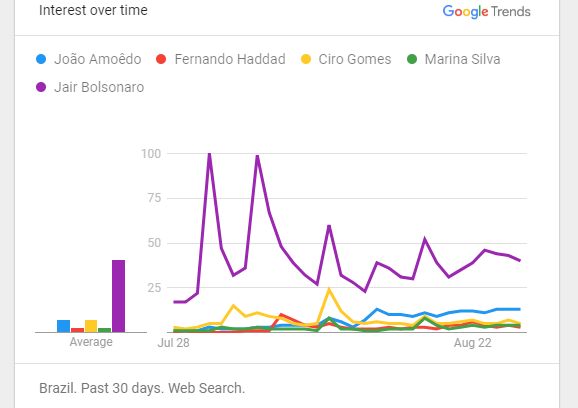 O pico de interesse por Bolsonaro ocorreu no dia 31 de julho, quando o ex-capitão participou do programa Roda Viva. Nas semanas seguintes, houve queda e estabilização na quantidade de buscas, que mesmo assim continuam muito acima dos outros candidatos.