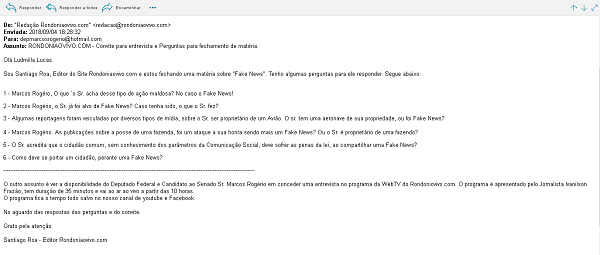 Desde a última terça-feira (4), o Rondoniaovivo enviou um questionário para a assessoria do deputado federal Marcos Rogério sobre um vídeo que compartilhou na sua rede social a respeito das famigeradas "Fake News", que são divulgadas sem nenhum embasamento da verdade.