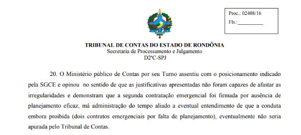 Na fiscalização, o Ministério Público de Contas opinou no sentido de que as justificativas apresentadas não foram capazes de afastar as irregularidades e demonstram que a segunda contratação emergencial foi firmada por ausência de planejamento eficaz, má administração do tempo aliado a eventual entendimento de que a conduta embora proibida (dois contratos emergenciais por falta de planejamento).