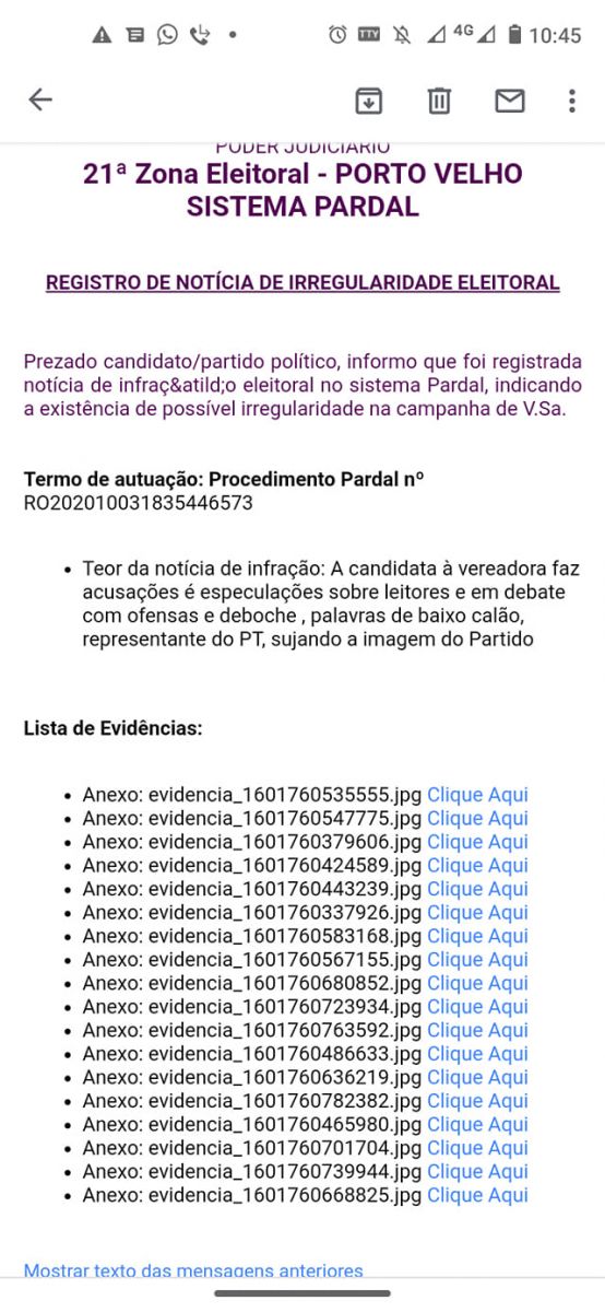 Em sua página no Facebook ela publicou uma notificação da 21° Zona Eleitoral de Porto Velho, informando uma denuncia registrada contra ela através do sistema Pardal, aplicativo criado pelo Tribunal Regional Eleitoral – TRE, o Pardal serve como uma linha direta com a Justiça Eleitoral.