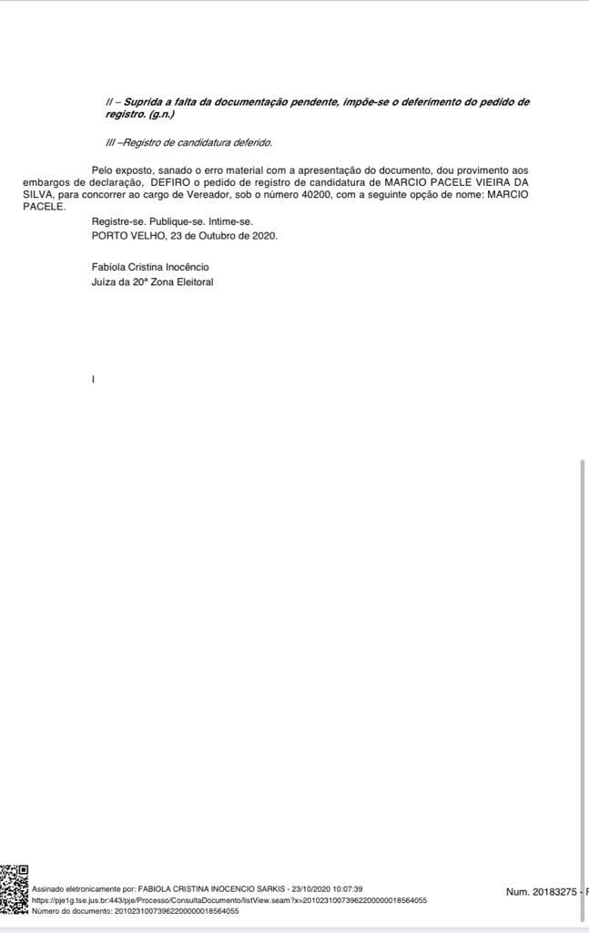 Pelo exposto, sanado o erro material com a apresentação do documento, dou provimento aos embargos de declaração, DEFIRO o pedido de registro de candidatura de MARCIO PACELE VIEIRA DA SILVA, para concorrer ao cargo de Vereador, sob o número 40200, com a seguinte opção de nome: MARCIO PACELE.