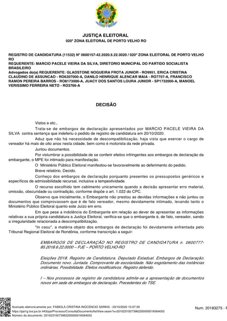 A assessoria do Vereador MÁRCIO PACELE (PSB) informa a todos os eleitores de Porto Velho e Distritos que, após recurso (embargos), o Ministério Público Eleitoral deu parecer pelo DEFERIMENTO, acatado pela Justiça Eleitoral sendo proferida a DECISÃO PELO DEFERIMENTO no seu registro de candidatura ao cargo de Vereador nas ELEIÇÕES de 2020.