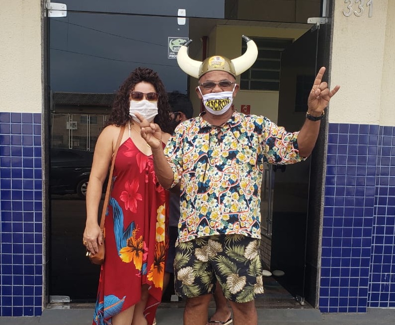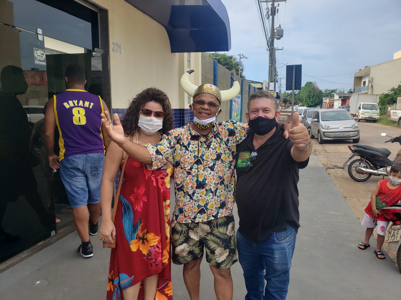 Usando seu característico chifre e acompanhado de sua namorada ele seguiu até sua sessão eleitoral