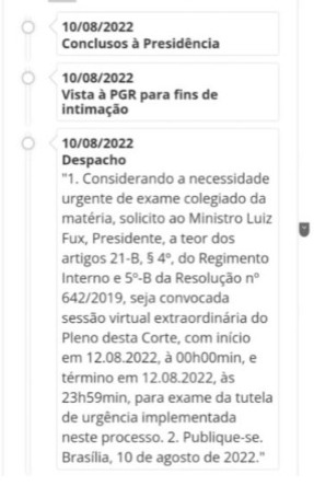 Em seu despacho, Nunes Marques pediu a convocação da sessão extraordinária para esta sexta-feira (12). Como são situações parecidas, os ministros irão julgar os casos de Cassol e do senador Acir Gurgacz. O presidente do STF, Luiz Fux, já marcou a sessão para o plenário virtual, que deve ser encerrada às 23:59 do mesmo dia.