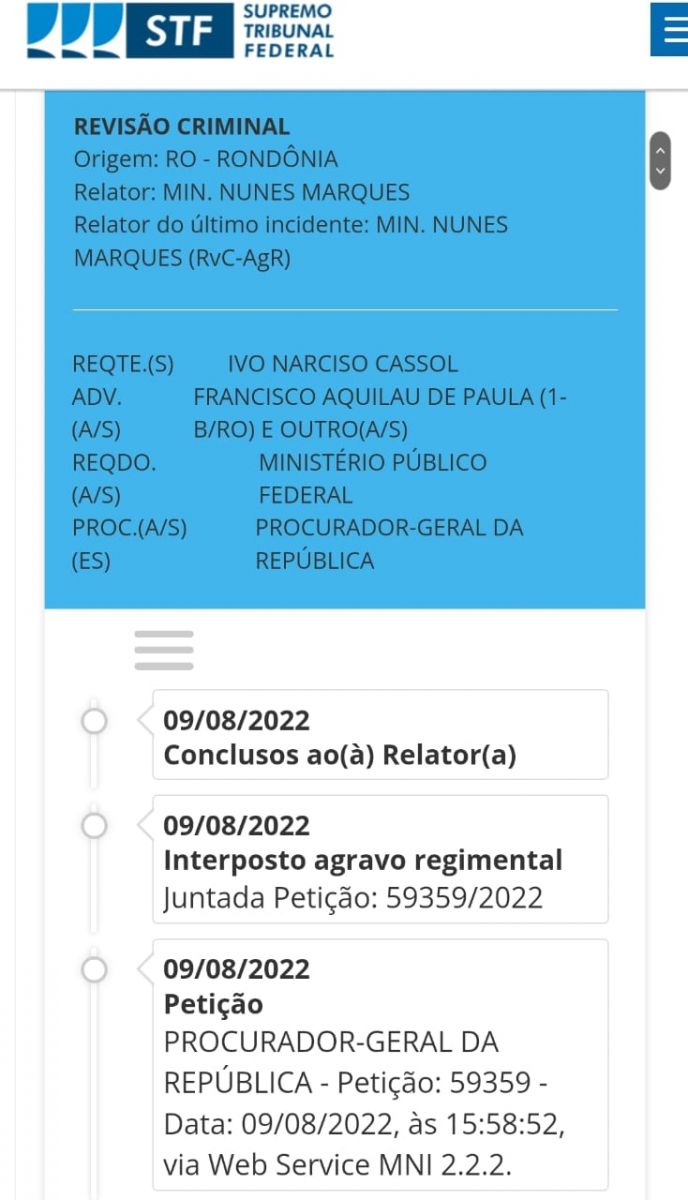 A Procuradoria Geral da República (PGR) interpôs na terça-feira (09) um agravo regimental (recurso) contra decisão monocrática (sentença de apenas um magistrado) do ministro Nunes Marques, do Supremo Tribunal Federal (STF), que suspendeu a inegibilidade do ex-governador Ivo Cassol (PP).