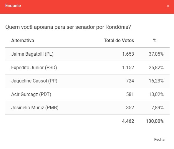 Na enquete ainda apareceu Acir Gurgacz (PDT) com 13,02% (581). Em último, ficou Josinelio Muniz (PMB) com 7,89% (352).