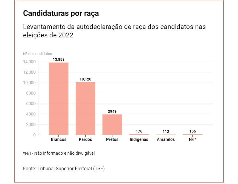 Uma mudança significativa nas eleições de 2022 foi a aumento de candidaturas de pessoas autodeclaradas pretas e pardas, que pela primeira vez desde que esse dado começou a ser informado, em 2014, superou o número de candidatos brancos. No total, pretos e pardos representam 49,67% ante 48,76% de brancos.