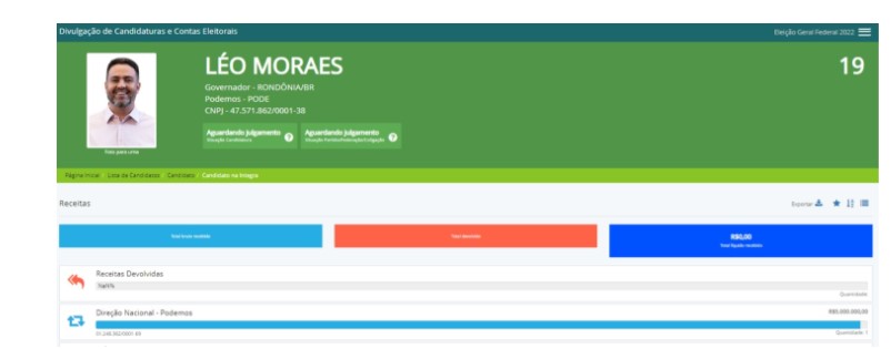 Léo Moraes recebeu do fundo partidário 5 milhões de reais, e já gastou com a campanha de inicio R$1.474.424,23.