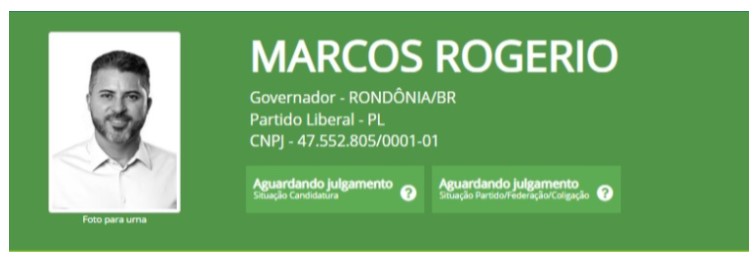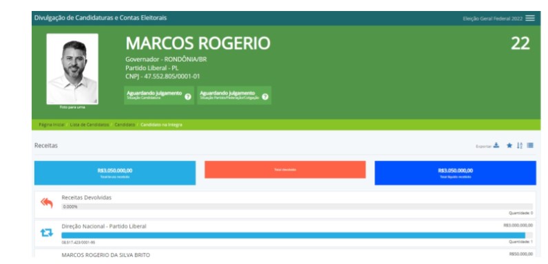 O atual Senador Marcos Rogério do União Brasil recebeu já sua conta de campanha 3 milhões de reais