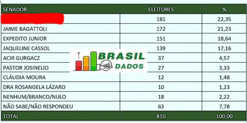 Levando em conta a margem de erro, o ex-senador Expedito Junior (PSD) também está empatado tecnicamente com XXXXXXX e Bagattoli, com 18,64% das intenções de voto. Jaqueline Cassol aparce com 17,16%. O senador Acir Gurgacz (PDT) está com 4,57%, Pastor Josinélio (PMB) – 3,33%, Cláudia Moura (MDB) está com 1,48% e Rozângela Lázaro (AGIR), com 1,23%.