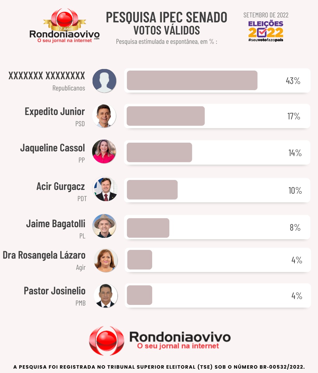 Segundo a instituição, xxxxxxx xxxxxx* (Republicanos) tem 43% dos votos válidos para o Senado em Rondônia. Já Expedito Júnior (PSD) e Jaqueline Cassol (PP) estão tecnicamente empatados em segundo lugar (dentro da margem de erro), com 17% e 14%, respectivamente.
