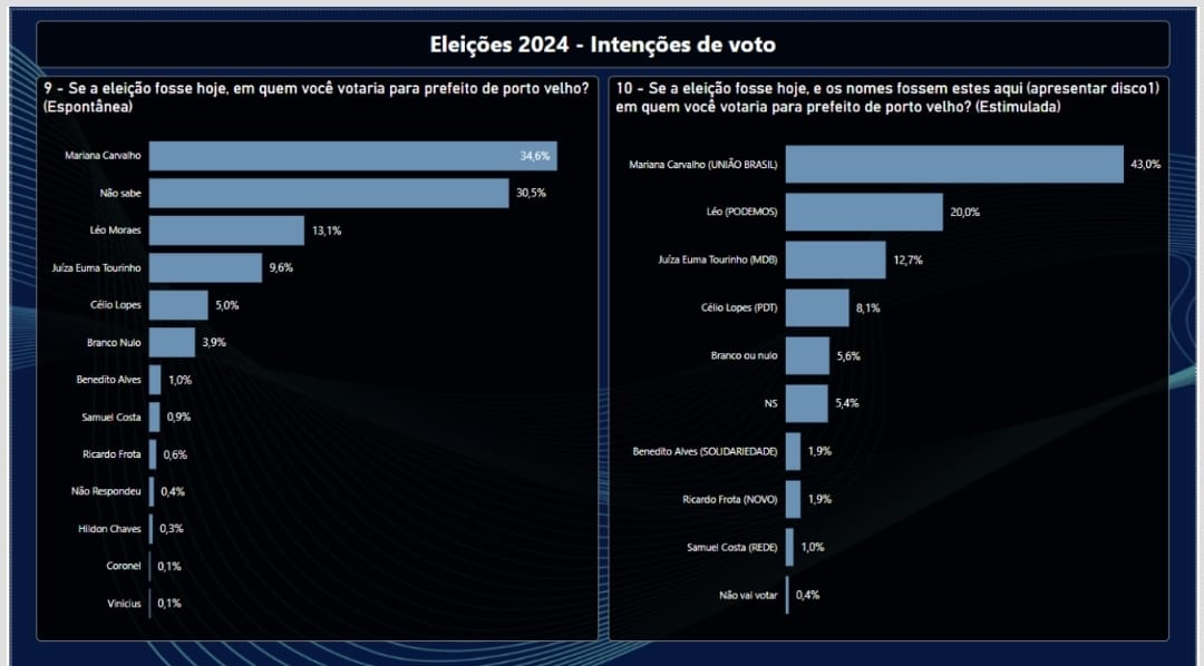 Conforme a pesquisa, Mariana Carvalho está com 43%, seguida por Léo Moraes com 20% e Euma Torinho com 12,7%. Vale destacar que, conforme a margem de erro, o segundo lugar está em empate.