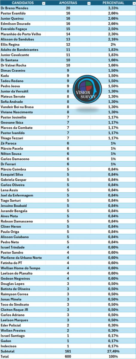 Se a eleição fosse hoje, os 23 mais votados seriam: Dr. Breno Mendes (3,33%), Pastor Evanildo, Junior Queiroz, e Edimilson Dourado, empatados com 2,66%, Everaldo Fogaça (2,50%), Maranhão do Porto Velho (2,30%), Alisson do Sanduba´s (2,16%), Ellis Regina (2,0%); Mais abaixo, empatados com 1,83% vem: Adalto do Bandeirantes e Junior Cavalcante; Dr. Santana e Dr. Vanei Rocha estão empatados com 1,66%; Empatados com 1,50% estão Dimas Craveiro, Kadu, Tadeu Redano e Pedro Jeová; Em Seguida, com 1,30% estão empatados, Junior da Versátil, Mateus Serrate, Sofia Andrade, Vandeir Boi na Brasa e Viviane Nascimento; e, Por último, Pastor Josinélio, Geovane Ibiza, Marcos da Combate, Pastor Ivanildo, e Thiago Tezzari.